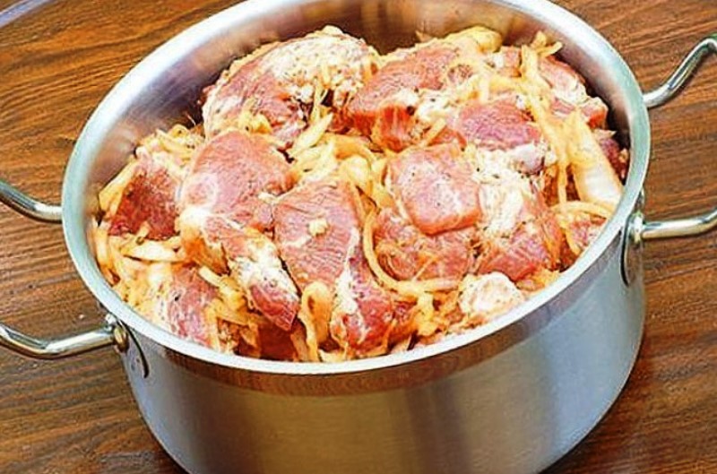 - Mėsą pjaustome įprastiniais gabalais ir sumaišome su marinatu. Darome tai labai kruopščiai, kad mėsos skaidulos prisigertų marinato.