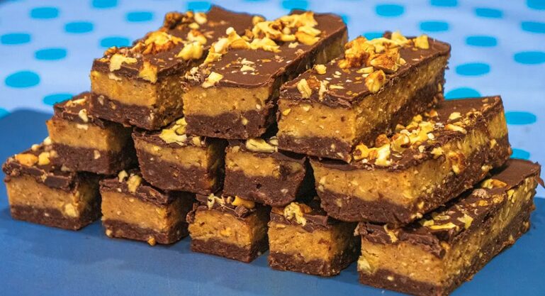 Padėkite į šaldytuvą 2–3 valandoms. Desertas puikiai išlaikys formą, jį lengva išimti dėl pergamento. Supjaustykite mažais kvadratėliais – gausite naminius saldainius, tankius, aromatingus ir traškius.