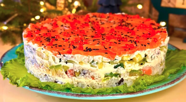 Prieš patiekdami nuimkite formos žiedą, papuoškite raudonais ikrais, sezamo sėklomis ir salotų lapais. Pjaukite aštriu peiliu, kiekvieną kartą jį sudrėkindami.