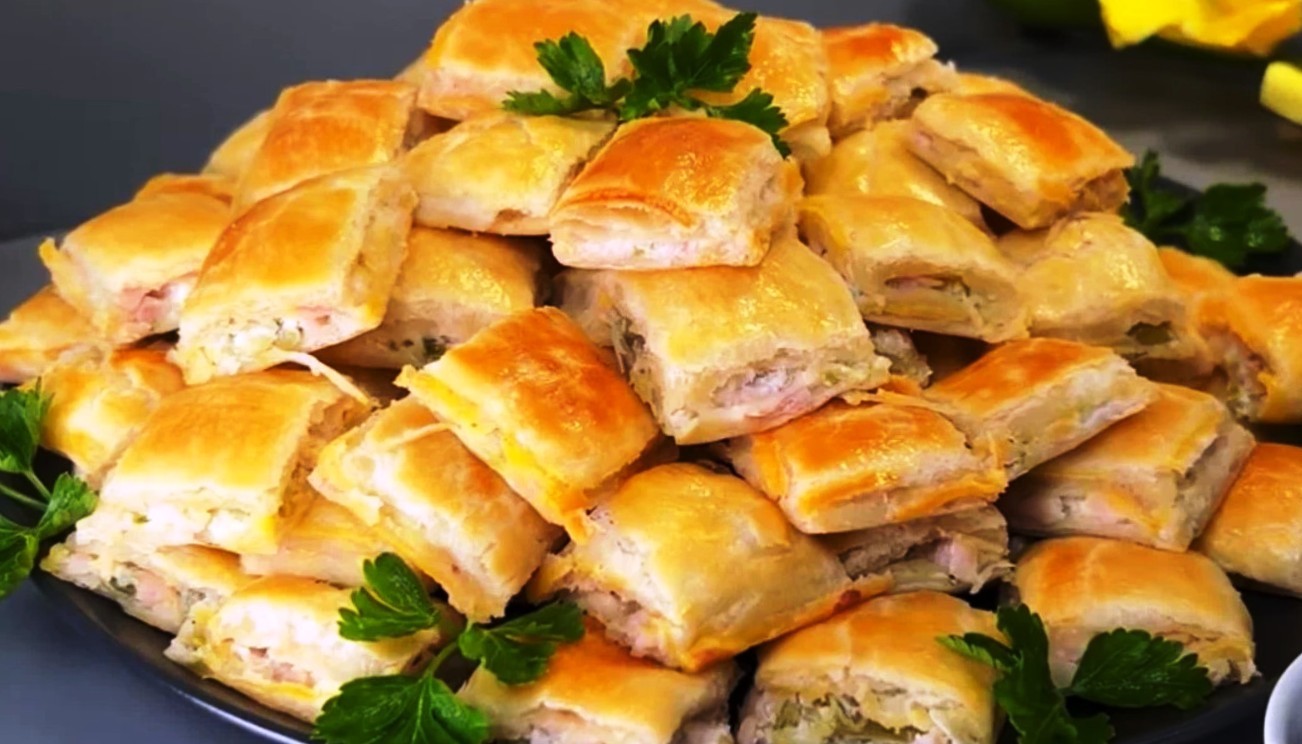 Tai vienas iš paprastų ir labai skanių užkandžių, kurį galima paruošti iš sluoksniuotos tešlos. Įdaras universalus ir puikiai tinka įvairioms šventėms.