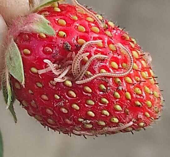Šiurpą keliantis vaizdas rodo ne grėsmingą katastrofą, o natūralią gamtos grandinę – braškes puola vaisinių muselių (Drosophila spp.) lervos arba uoginių kandžių (Grapholita funebrana) vikšrai. Tai kenkėjai, kurie mėgsta saldžius, minkštus, pernokusius vaisius. Jų kiaušinėliai dedami į dar neišsiskleidusius ar jau sunokusius vaisius, o išsiritusios lervos puikiai jaučiasi šiltame, drėgname ir saldžiame minkštime.