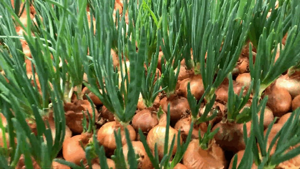 Po 25 dienų – maždaug 70% svogūnėlių bus sudygę, ūgliai sieks apie 15 centimetrų. Tai normalus rezultatas su mirkymu ir reguliariu laistymu.