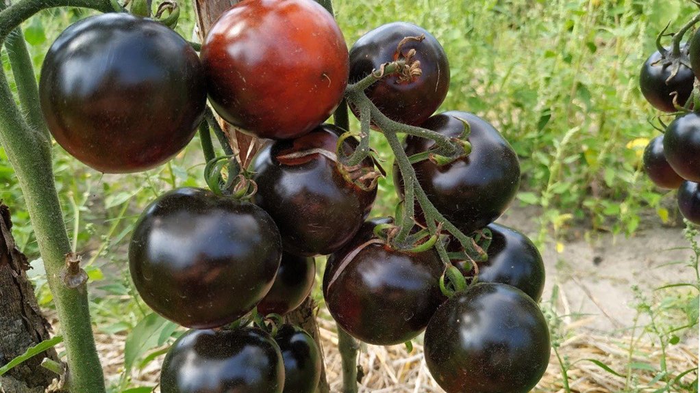 „Per pirmą sezoną padariau klaidą – pasodinau per pavėsį”, – prisipažino Zita. Pomidorai užaugo, bet liko žalsvi, be jokio mėlynumo. Antocianinai susidaro tik tiesioginėje saulės šviesoje. Kuo daugiau saulės patenka ant vaisiaus, tuo tamsesnė ir ryškesnė spalva.