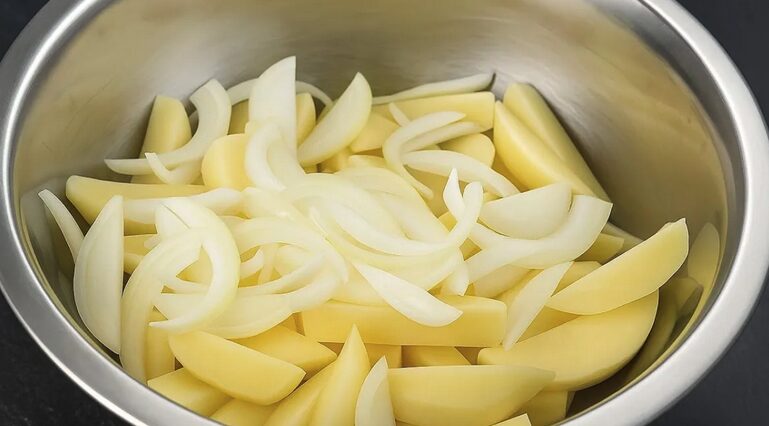 Bulves nulupkite ir supjaustykite vidutinio dydžio gabalėliais – nei per stambiais, nei per smulkiais, kad tolygiai iškeptų. Svogūną supjaustykite plunksnomis ir sudėkite prie bulvių.