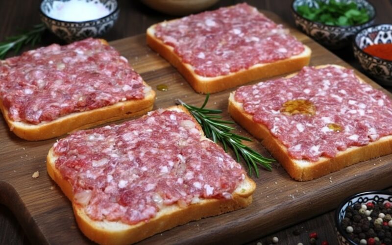 Ant kepimo skardos, išklotos kepimo popieriumi, sudedame duonos riekeles. Sutarkuojame sūrį vidutinio stambumo tarka. Ant duonos paskirstome paruoštą faršą per visą paviršių.