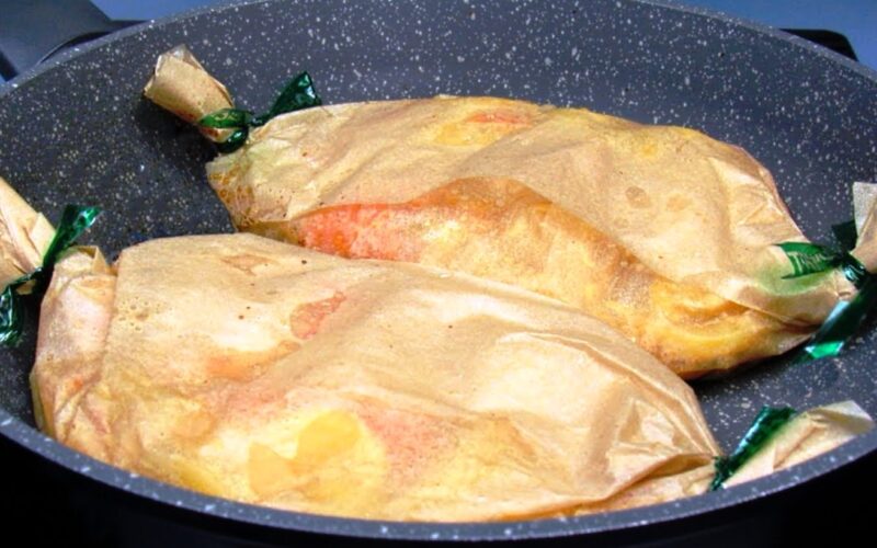 Kiekvieną dalį dedame į atskirą kepimo popieriaus lapą, suvyniojame ir užsukame galus.