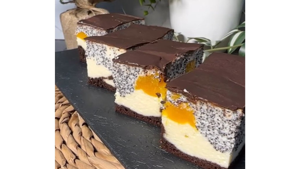 Kai reikia deserto, kuris atrodytų šventiškai ir skanautų dar geriau – šis pyragas niekada nenuvilia. Tamsus šokoladinis pagrindas, kreminis varškės sluoksnis su aguonomis ir blizgantys persikai viršuje. Trys skoniai, trys tekstūros, vienas tobulas desertas.