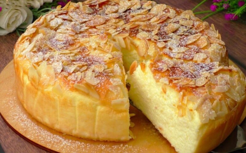 5. Rekomenduojame prieš kepimą papuošti varškės masę migdolų drožlėmis.