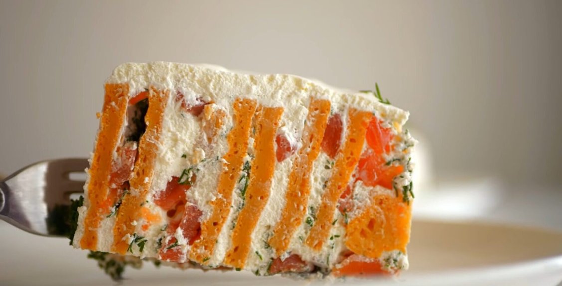 Įsivaizduokite: ant šventinio stalo stovi elegantiškas cilindras, padengtas švelniai blizgančia glazūra. Atrodo kaip iš konditerijos vitrinų. Bet kai perpjaunate – atsiveria hipnotizuojanti spiralė, kurioje pinasi biskvitas, sūrio kremas ir rūkyta žuvis.