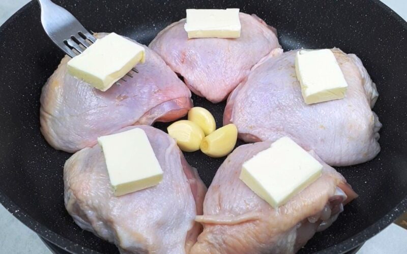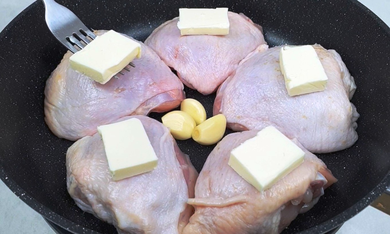 Įkaitinkime keptuvę su augaliniu aliejumi ir kepkime šlauneles ant vidutinės ugnies po 5–6 minutes kiekvieną pusę. Kai apačia įgauna auksinį atspalvį, ant kiekvienos šlaunelės uždėkime po gabalėlį sviesto.